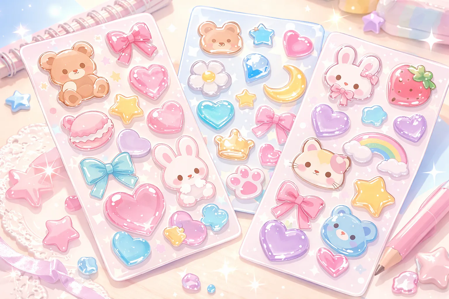 レジンのような質感があり、シール帳やスマホケース、手帳デコなどに使われることが多く、最近は「シール交換」ブームの影響で大人世代にも人気が広がっています。